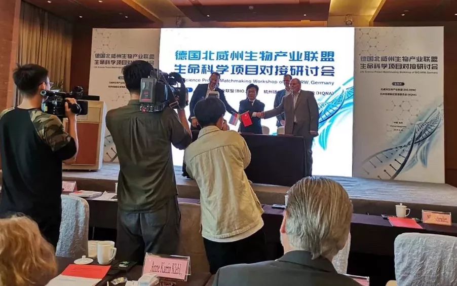 5月10日(周五)上午, 錢塘新區(qū)與德國北威州生物產(chǎn)業(yè)聯(lián)盟舉辦項目合作對接會并簽署合作備忘錄 。北威州生物產(chǎn)聯(lián)盟主席Dr. Nils Schrader致辭并介紹ChInValue計劃,杭州市投資促進局徐文霞副局長、錢塘新區(qū)管委會副主任王永芳、于利希研究中心外部資金管理主管Mr.Immo Wetcke共同簽署合作備忘錄。