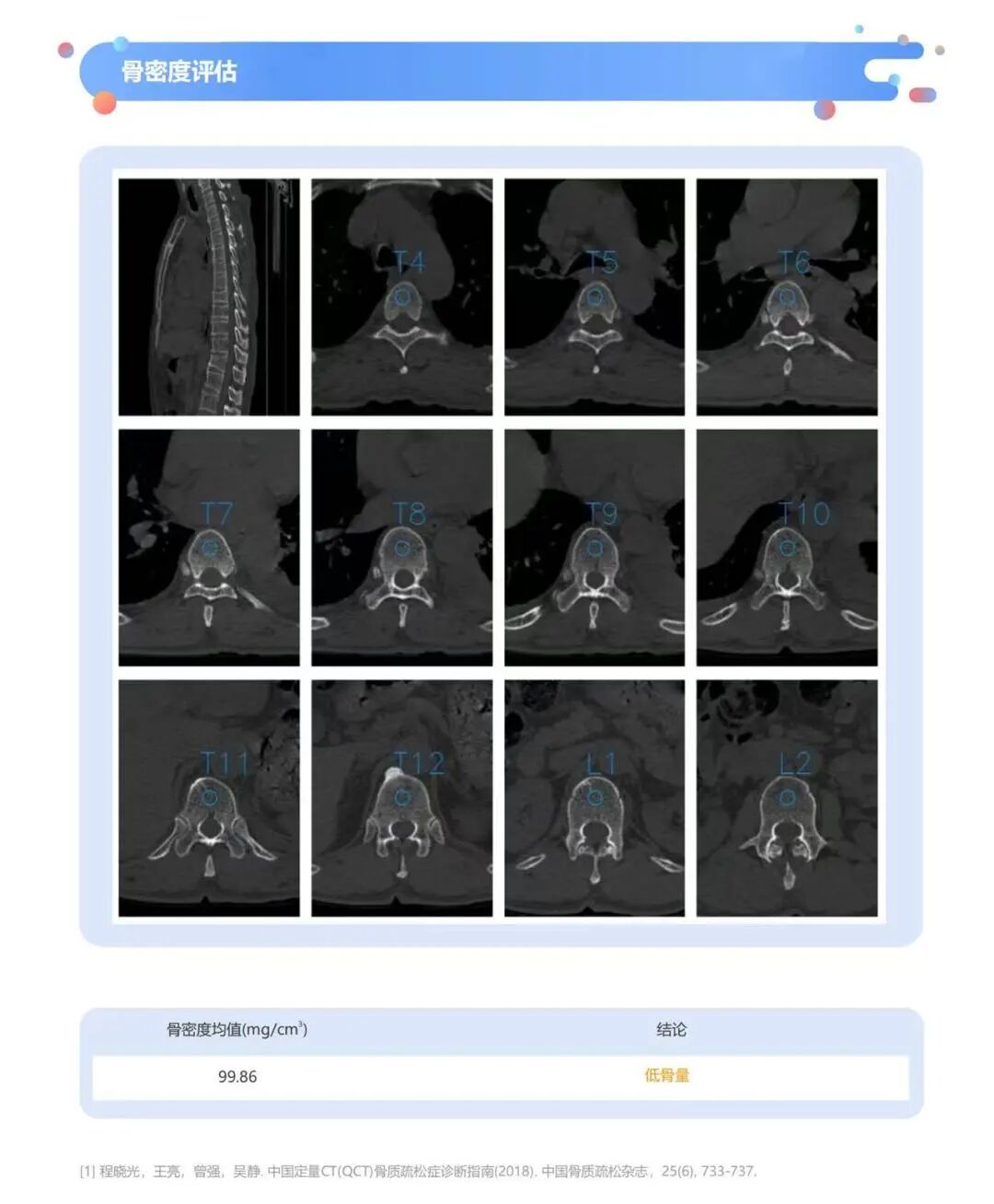 2025 年版《成人健康體檢項(xiàng)目推薦指引》明確:40 歲以上人群常規(guī)體檢新增骨密度檢測(cè)項(xiàng)目,體脂率、肌肉脂肪分布情況也納入檢查,且定量 CT(QCT)被列為骨密度檢測(cè)優(yōu)先推薦。 健培啄醫(yī)生胸部CT一檢多篩無(wú)需額外掃描,依托常規(guī) CT 影像即可完成骨密度檢測(cè),實(shí)現(xiàn) “篩 - 診 - 評(píng)” 一體化,為 40 + 人群骨健康管理及骨質(zhì)疏松等慢性病風(fēng)險(xiǎn)評(píng)估,提供高效、精準(zhǔn)的技術(shù)支持,助力落實(shí)科學(xué)健康篩查。