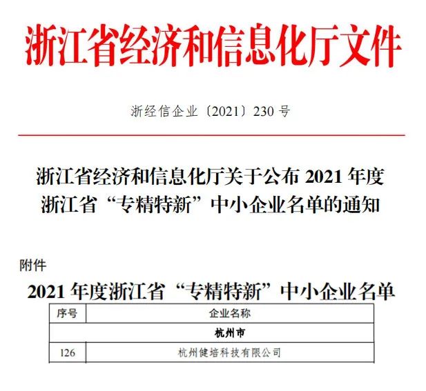 喜訊:健培科技成功入圍2021年度浙江省“專(zhuān)精特新”企業(yè)!