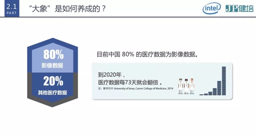 大象即醫(yī)學(xué)大數(shù)據(jù),包括電子病歷、影像、心電、病理、基因等大數(shù)據(jù),其中影像數(shù)據(jù)量最大,醫(yī)院存儲數(shù)據(jù)的80%以上來自影像數(shù)據(jù)。